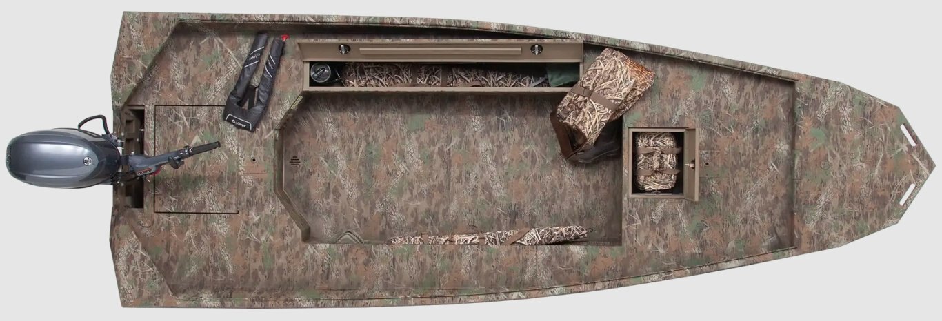 The handy gear shelf stores ammo, duck calls, and other small items within easy reach. Located below the catwalk, it allows free movement from bow to stern while also serving as a convenient ledge for sitting.